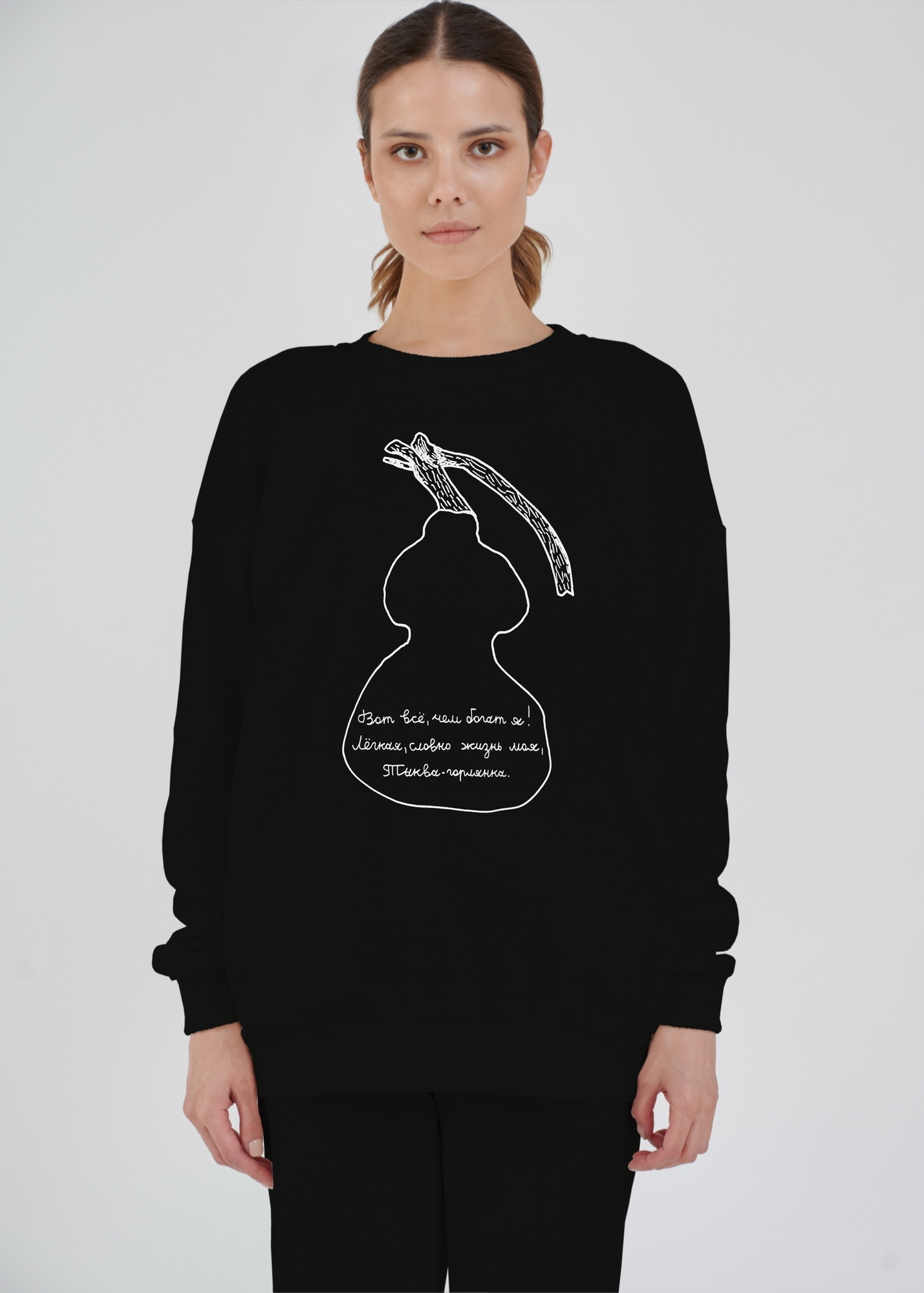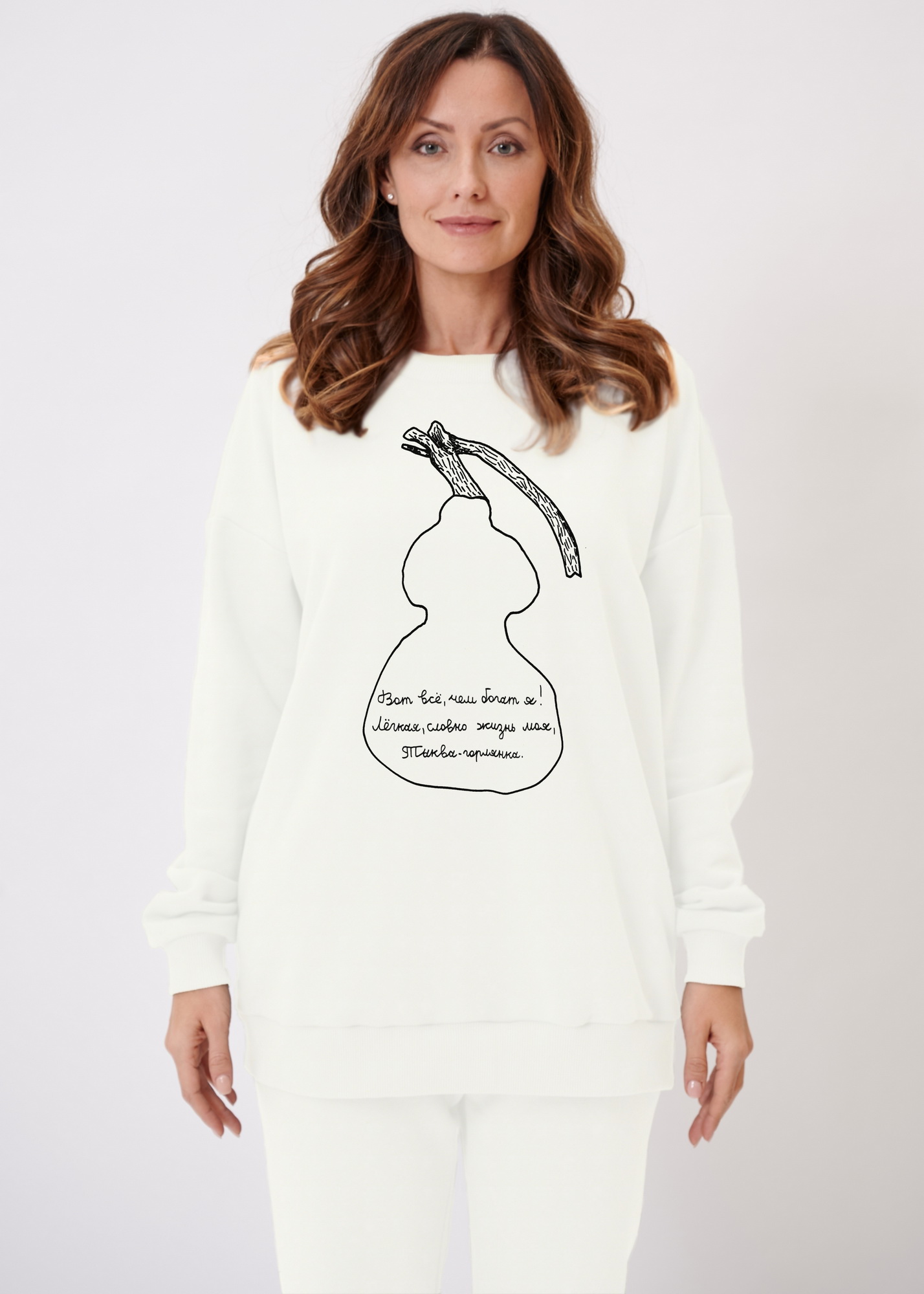 Параметры моделей на фото - 92-65-95 рост 175 см. На ней свитшот размера S (46) и 85-62-89 рост 174 см. На ней свитшот размера XS (44).