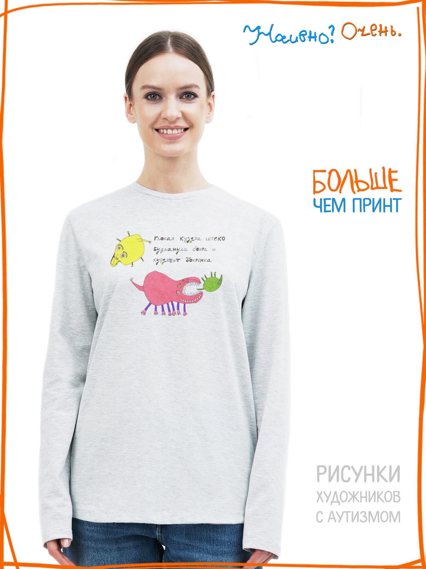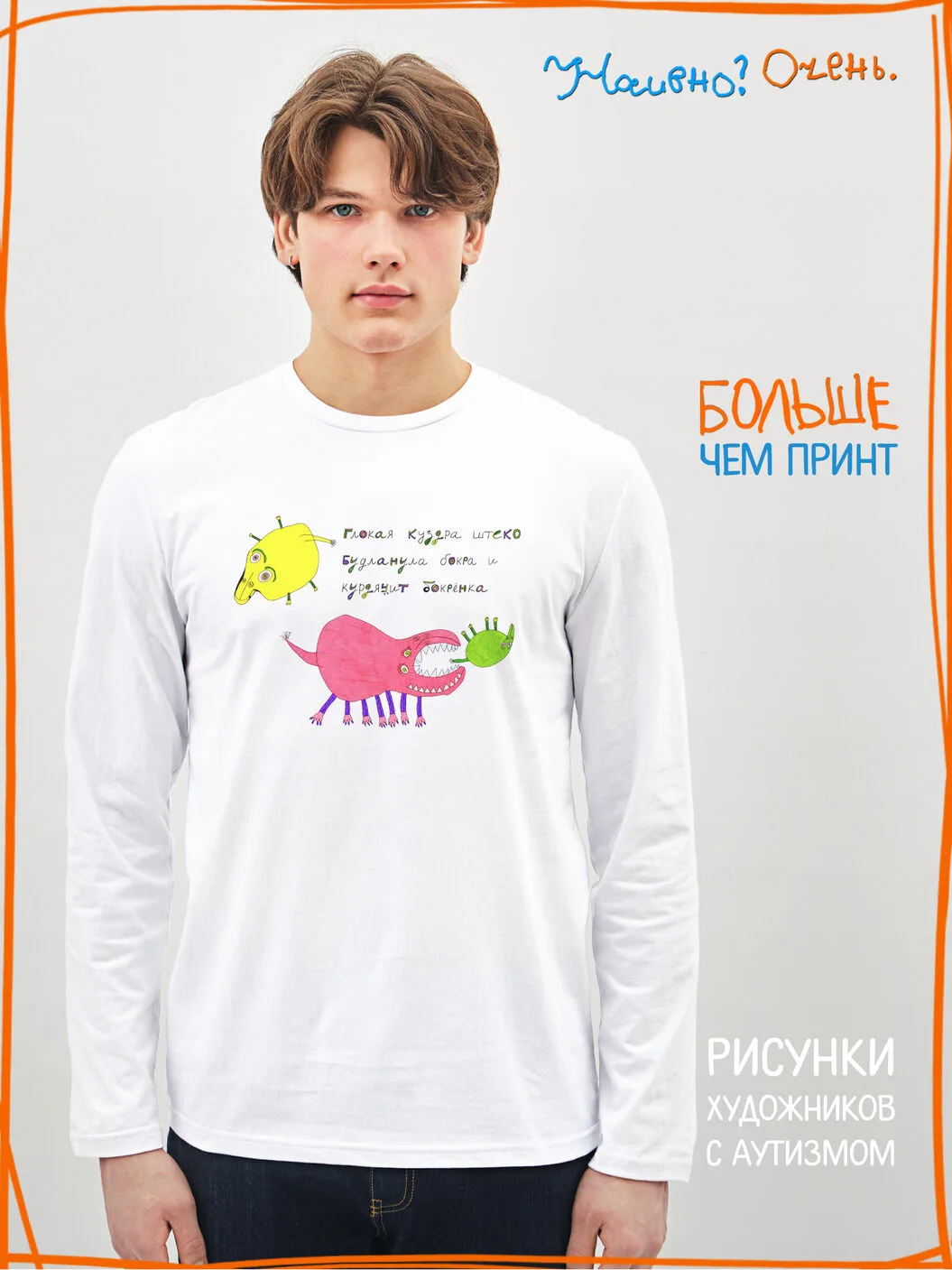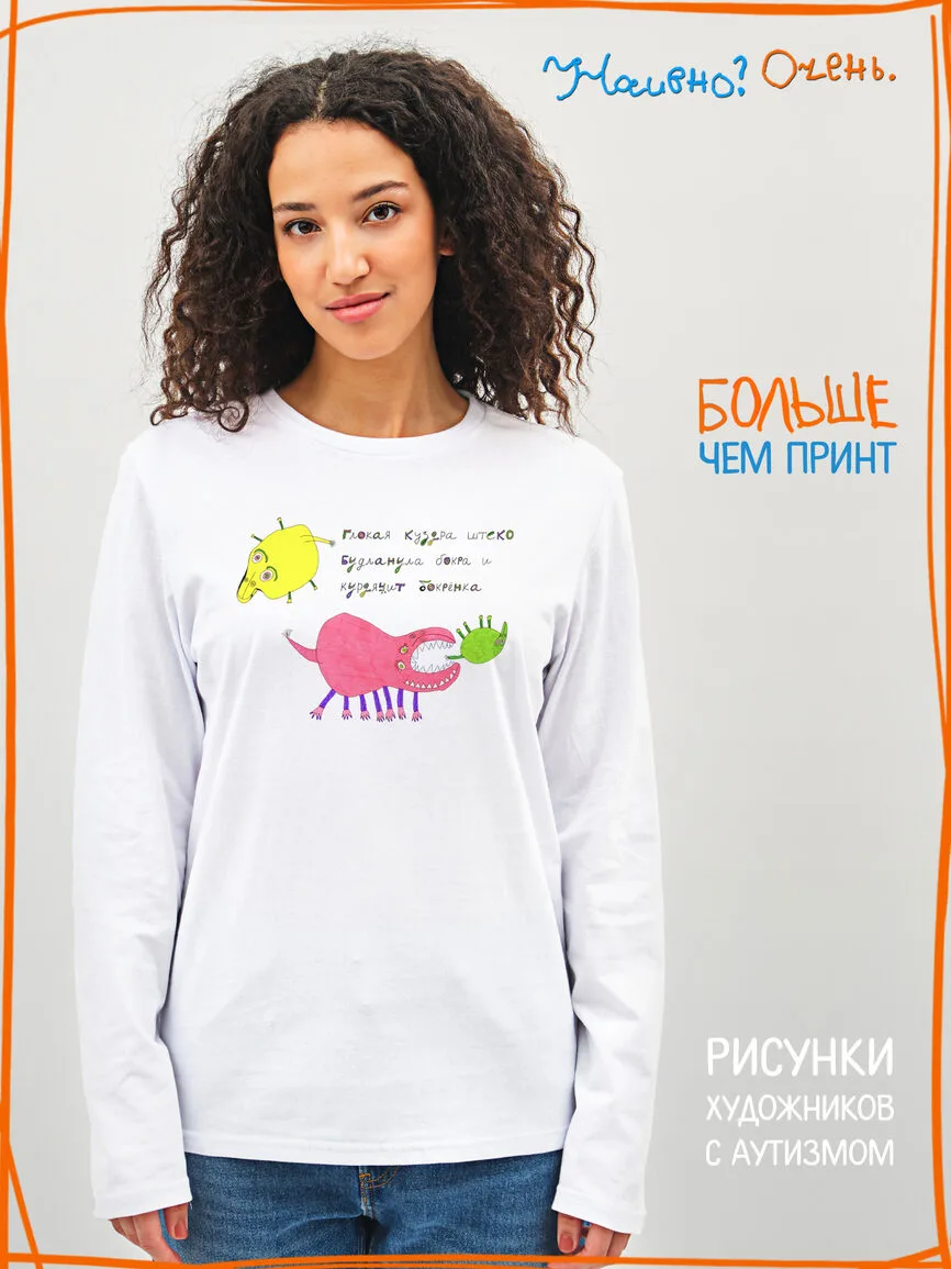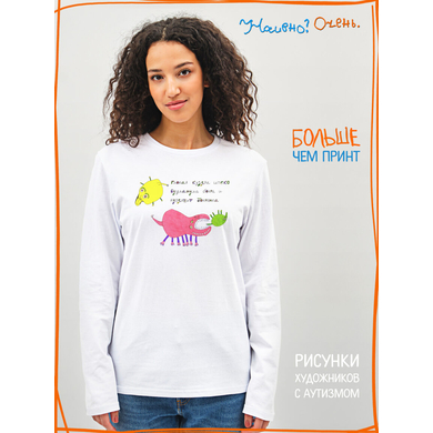 Лонгслив с рисунком нашего социального проекта - хороший подарок со смыслом на любой праздник. Наши вещи дарят тепло, радость и хорошее настроение. Этот проект создан для социализации и трудоустройства молодых людей с аутизмом и другими особенностями развития ментального характера. Творчество для таких людей - мостик в наш мир, возможность раскрыть свой потенциал, самореализоваться и зарабатывать. Печатая их рисунки на различной продукции, мы не только монетизируем их труд, но и получаем очень душевные вещи, которыми всегда приятно порадовать себя и близких. Каждая работа, представленная здесь, выполнена с любовью. Покупая эти очаровательные вещи, и даже просто рассказывая о нас, вы поможете сделать мир хоть немного добрее и лучше!